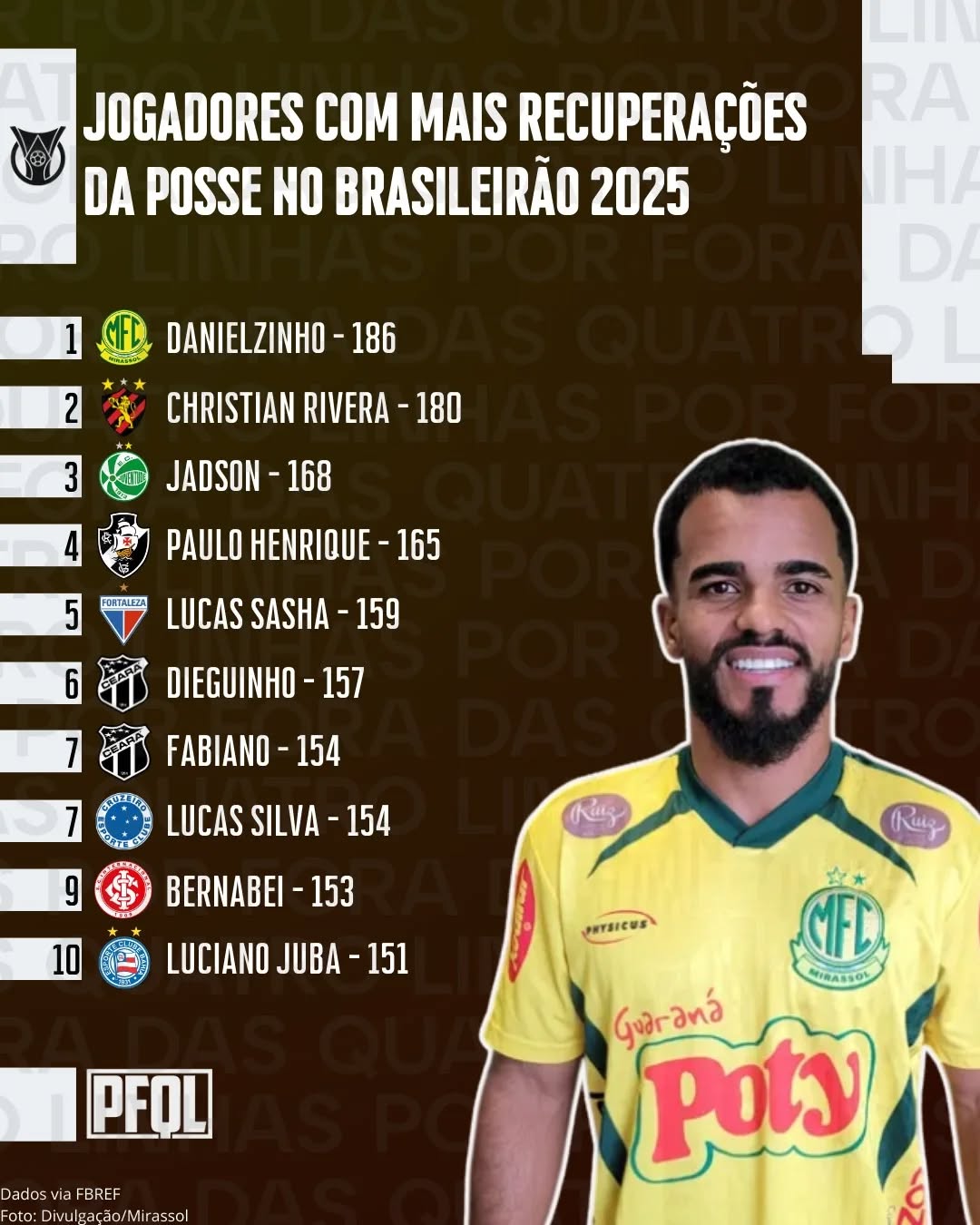 ⚽️ Danielzinho, do Mirassol e que está encaminhado para ir ao São Paulo, foi o líder de recuperações de bola no Brasileirão 2025. Foram 186, em 37 partidas no torneio, segundo o FBREF.