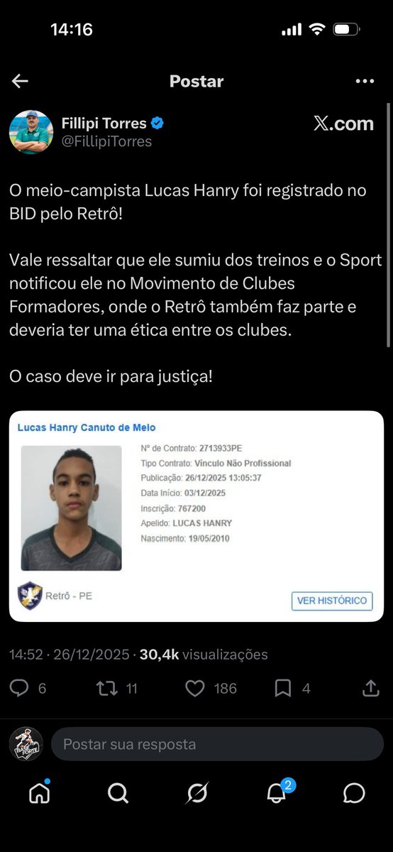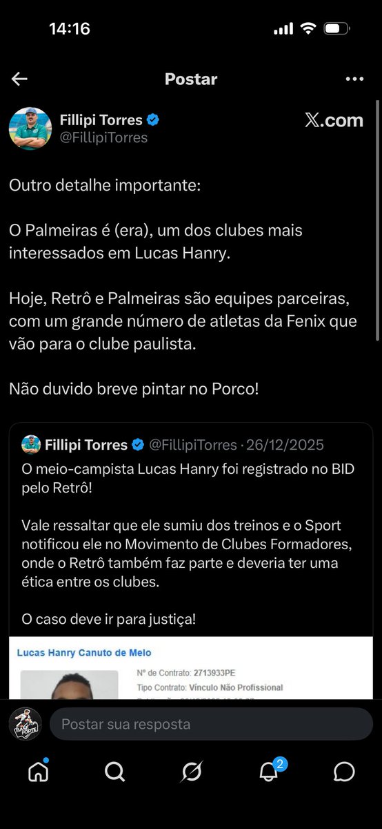 Lucas Hanry não chegou ao Palmeiras 6 meses atrás. Ele teve uma saída conturbada do Sport e repentinamente apareceu registrado como jogador do Retrô. E só chegou ao palmeiras em fevereiro de 2026.